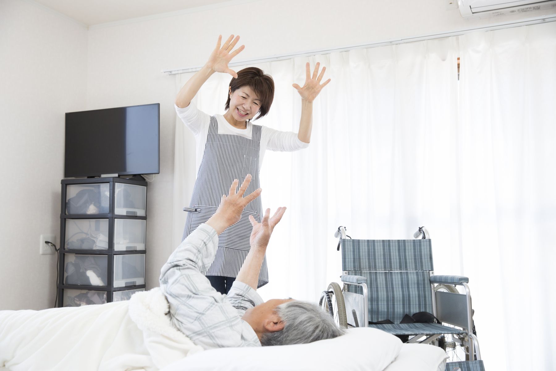 「去洗澡也可以分段喔!」個管師告訴松樹姆仔:「可以讓他先坐在馬桶上,坐著洗,慢慢再試著讓他站起身來洗。」松樹伯仔很努力的學,復健師交代復健訓練一天要做幾次、每次要做幾回,松樹伯仔行有餘力都會再多做幾次。個管師每周幾次來探訪、了解練習狀況,慢慢的,松樹伯仔氧氣濃度使用得越來越低,大概從3降到1。