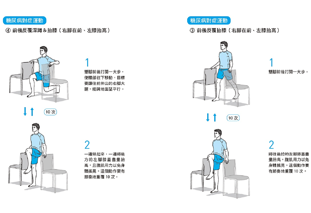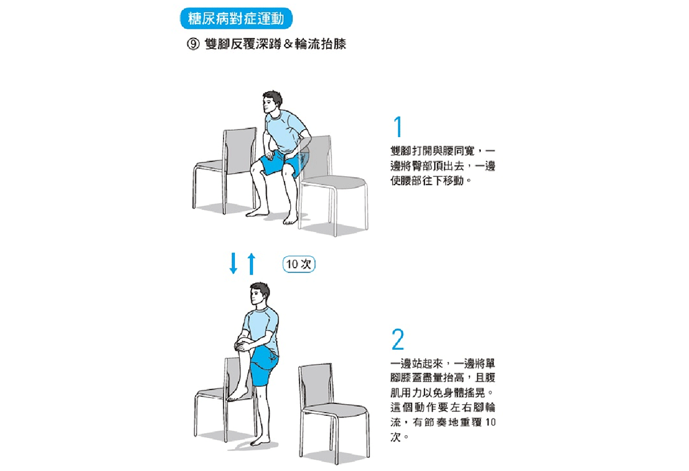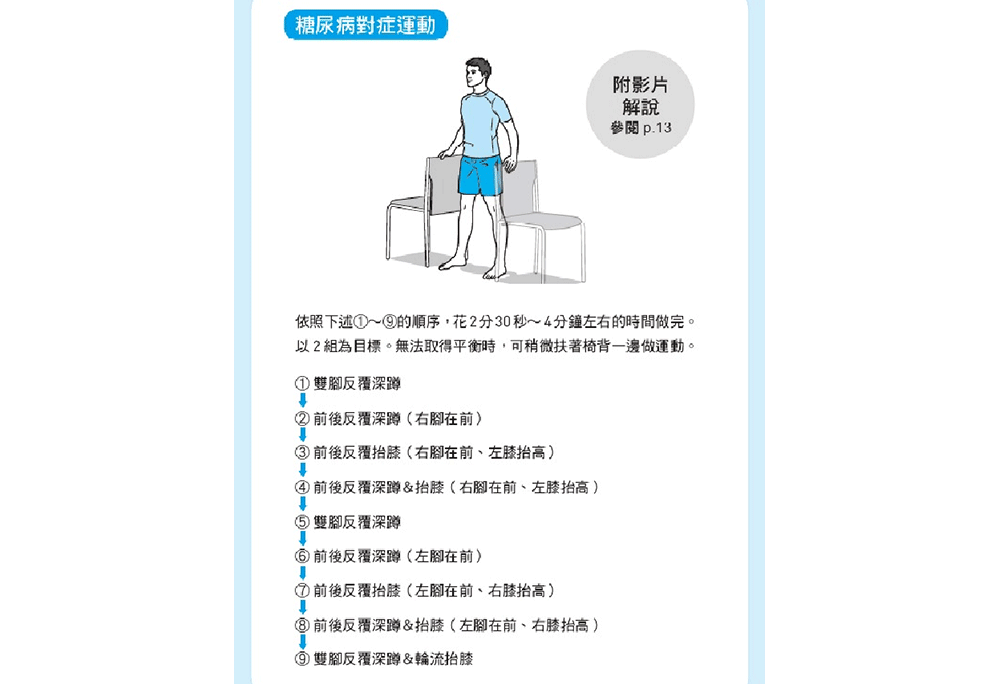 以下針對有糖尿病問題困擾的人,設計了結合有氧與肌肉訓練,有助於降低血糖值的對症運動。做一組約2分半鐘,慢慢做也只要4分鐘左右就能完成: