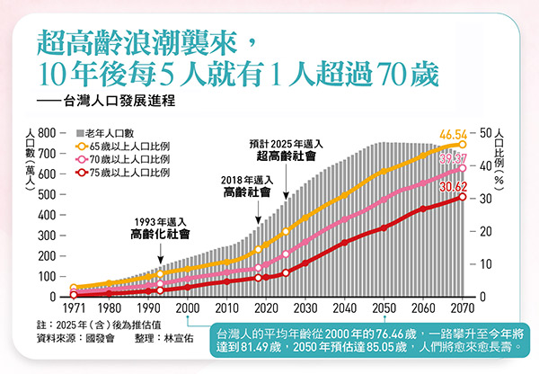 如果回到一九七○年,當時台灣男性平均能活到六十六·六六歲,女性則能活到七十一·五六歲,然而隨著醫療、生活條件飛速發展,二○二四年,台灣男性已能活到七十七·四歲,女性則能活到八十四·二八歲。