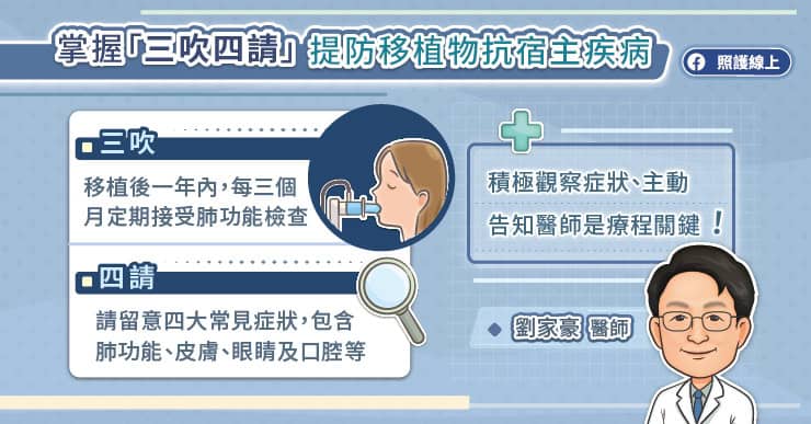 3、請掌握「三吹四請」,「三吹」指的是異體幹細胞移植(骨髓移植)後一年內,每三個月接受一次肺功能檢查;「四請」則是請留意肺功能、皮膚、眼睛、口腔這四個最容易受到影響的部位,如果出現咳嗽、喘、皮膚緊繃、眼睛乾澀、口腔發炎等症狀,要及早告知醫師。