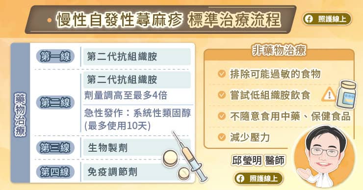 邱瑩明醫師說,若高劑量抗組織胺藥物仍無法有效控制症狀,標準治療流程的下一步是使用生物製劑。
