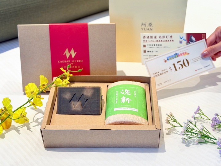 ▲台北凱達大飯店於周年慶期間推出住房專案,精緻雙人房2,888元起、家庭四人房4,888元起,專案贈送阿原聯名禮盒、向物及阿原抵用券。圖:台北凱達大飯店提供