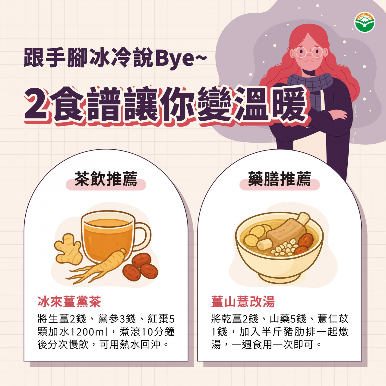 ● 吃暖身食物:老薑、蔥白、紅棗、桂圓、牛肉,多吃熱食、避免冷飲與冰品。