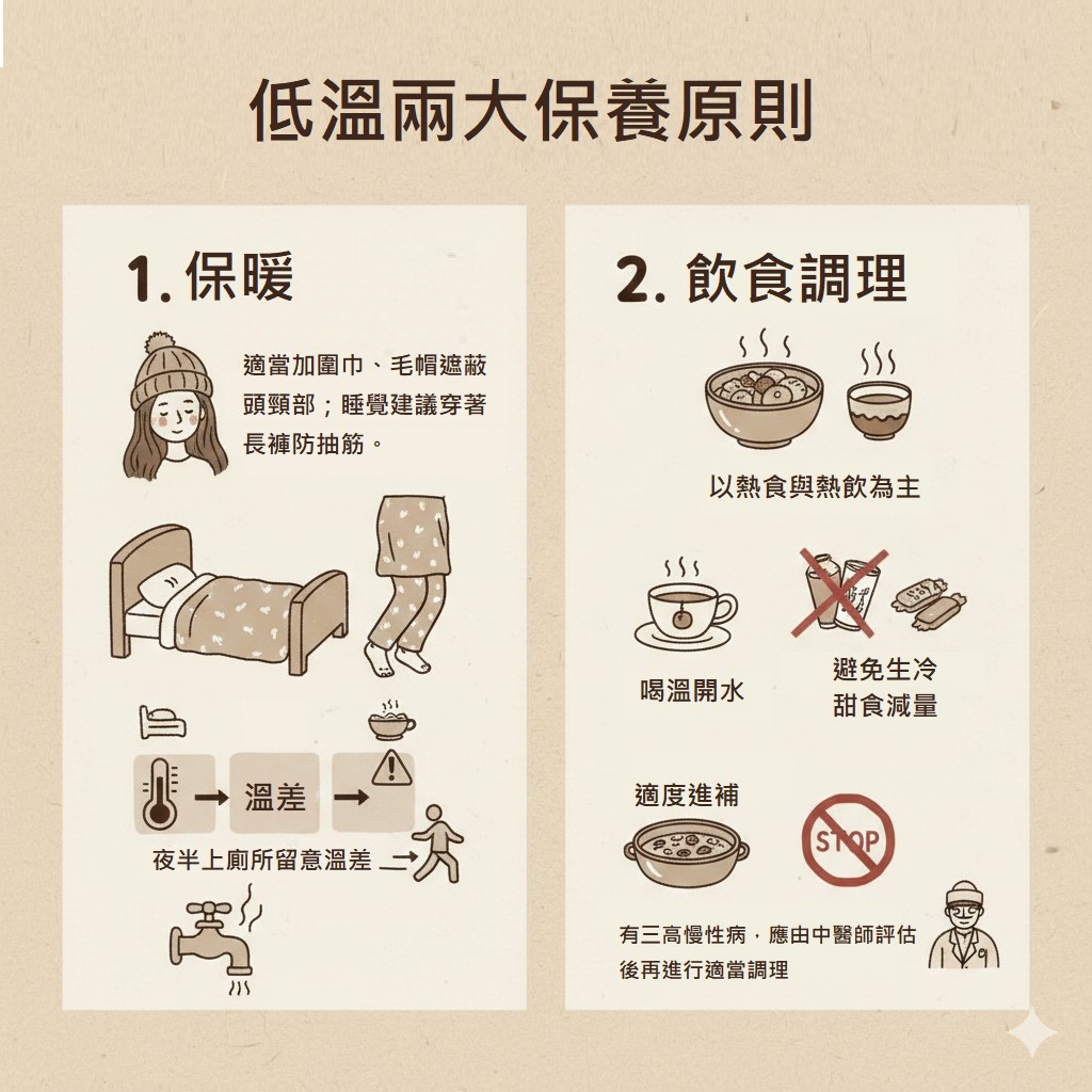 針對大寒時節的健康照護,陳中奎提出兩大保養原則,協助民眾降低寒冷與溫差對身體帶來的衝擊。