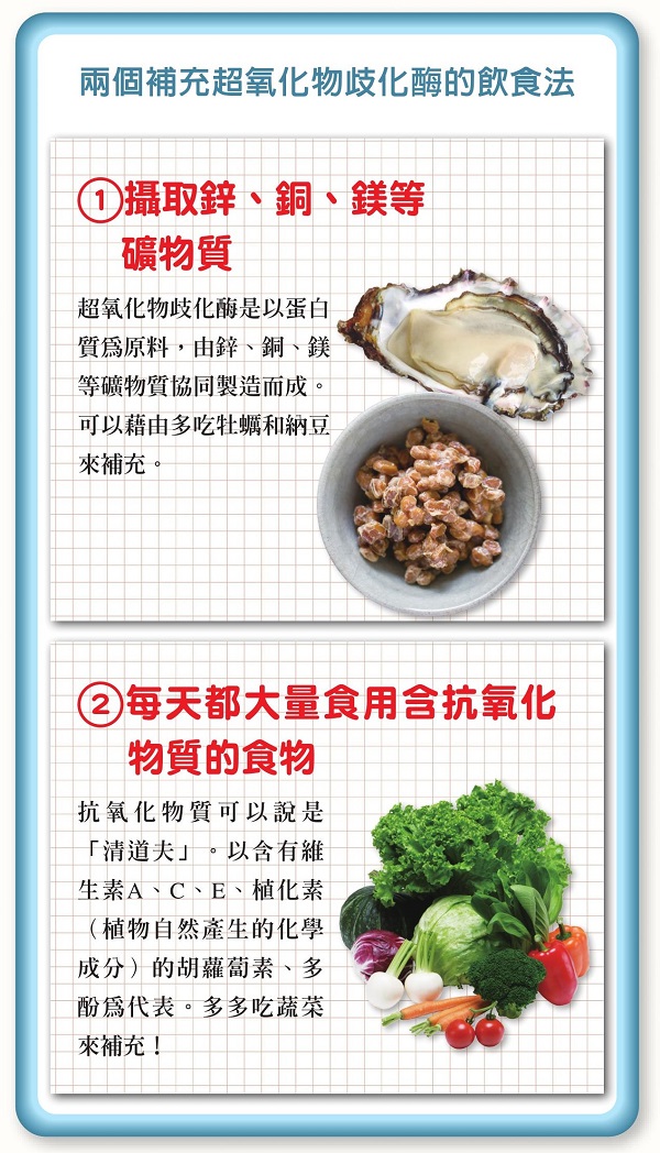 不過,人體體內有將活性氧無毒化的超氧化物歧化酶(SOD),生成量會在四十歲前後開始減少,但是可以藉由兩個飲食習慣來補充減少的超氧化物歧化酶(參照左圖)。