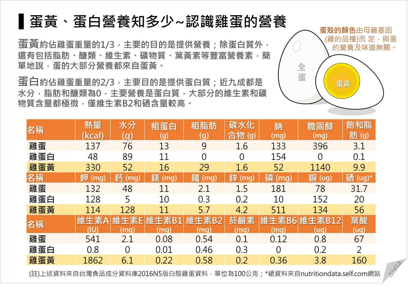 除蛋白質外,蛋黃還含醣類和脂肪,所以熱量較高,每百公克有330大卡,且因為發育自母雞的卵細胞,所以蛋黃膽固醇相當高。