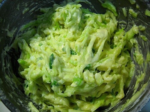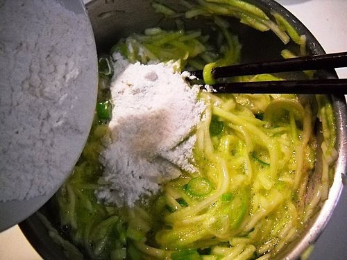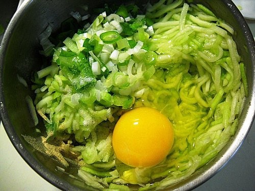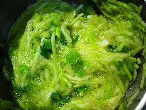 蔥切成蔥花,連同雞蛋、鹽、胡椒粉、白芝麻一起加入瓠瓜中拌勻。