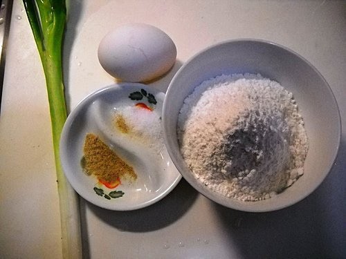 蔥一根、雞蛋一顆、鹽1/8t、麵粉一碗(八分滿)、胡椒粉少許、白芝麻適量。