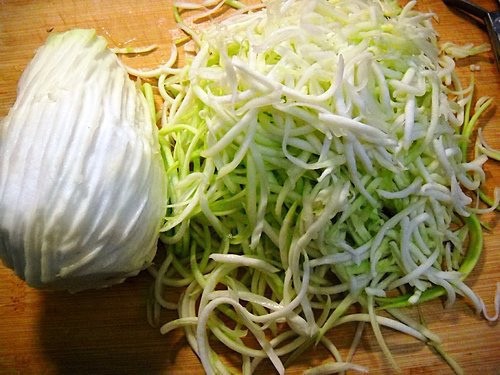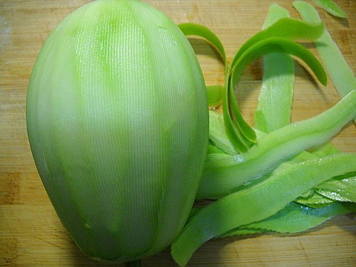 瓠瓜去皮刨絲,內囊不取用(因內囊不容易刨成絲,只取外表綠色的瓜肉)。