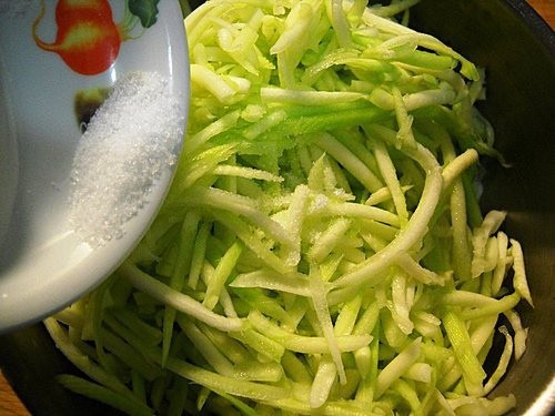 加入1/8t鹽抓取,等候10分鐘左右讓瓠瓜出水。