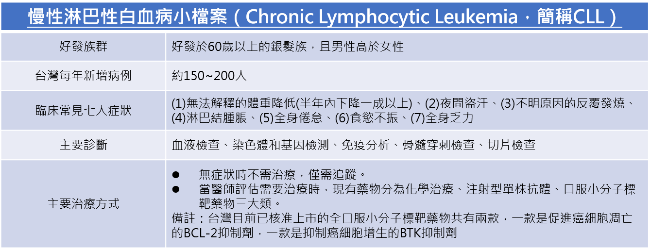 據行政院主計處統計,國人2016年平均壽命雖達到80歲,但是身體健康、不須仰賴他人的「平均健康餘命」僅71.2歲,即民眾最後餘生平均有8.8年受病痛所苦。台灣去(2018)年正式邁入高齡社會、2026年更進入超高齡社會,民眾要構築健康退休生活,應提高疾病意識。王銘崇醫師表示,好發在60歲以上銀髮族的慢性淋巴性白血病發生率逐年上升,每年新增病例數約150-200人,平均年齡約66歲。因為早期症狀不明顯或不具特異性,許多病人是因為做健檢時意外發現白血球過高,或是因為淋巴結腫大而求診。