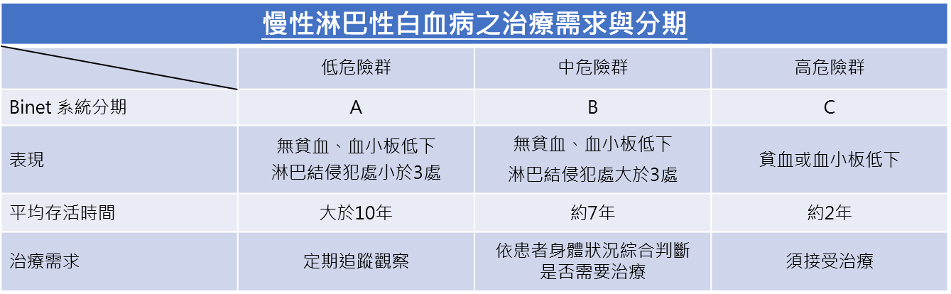備註:全球通用的慢性淋巴系白血病分期系統主要有兩種,除了上述的Binet氏分期系統外,亦有Rai分期系統。Rai分期系統依照病程,將患者分為0~4期(共五期),其中,0期屬低危險群,1期、2期屬中危險群,3期、4期屬高危險群。