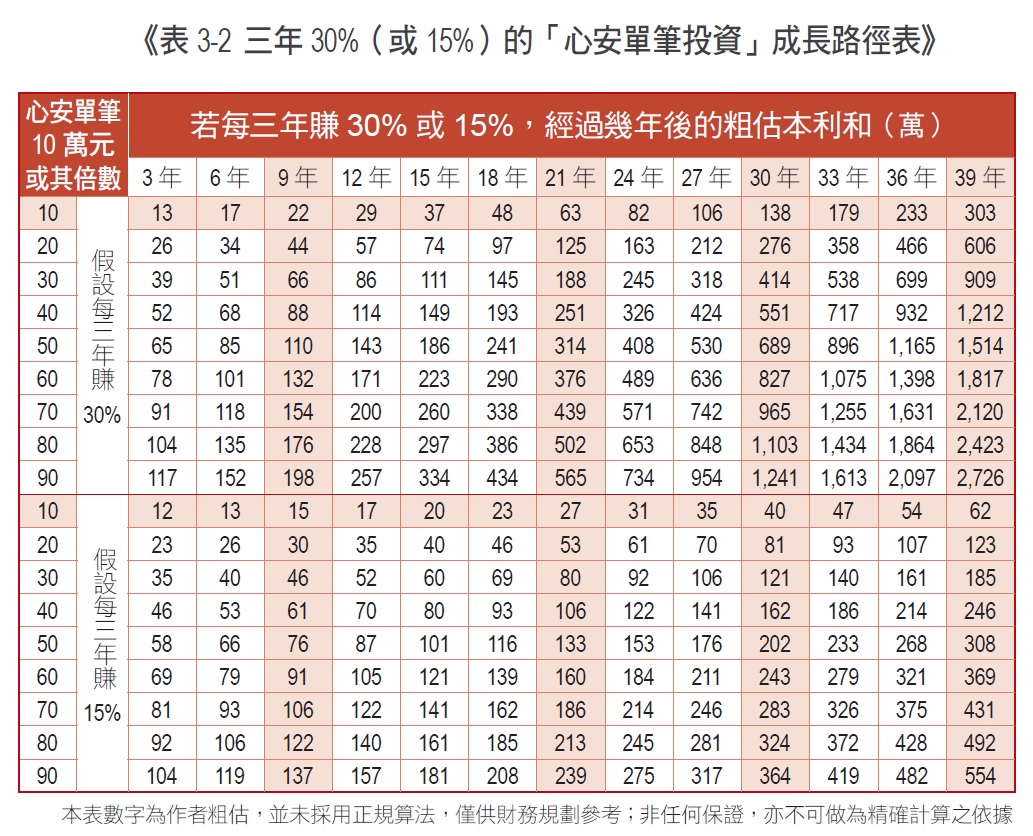 若做心安單筆10 萬元,查《表3-2》39 年底時,約62~303 萬。若有幸26 歲這麼年輕就可投入100 萬,則乘以10,到65 歲時可期待620~3,030 萬!
