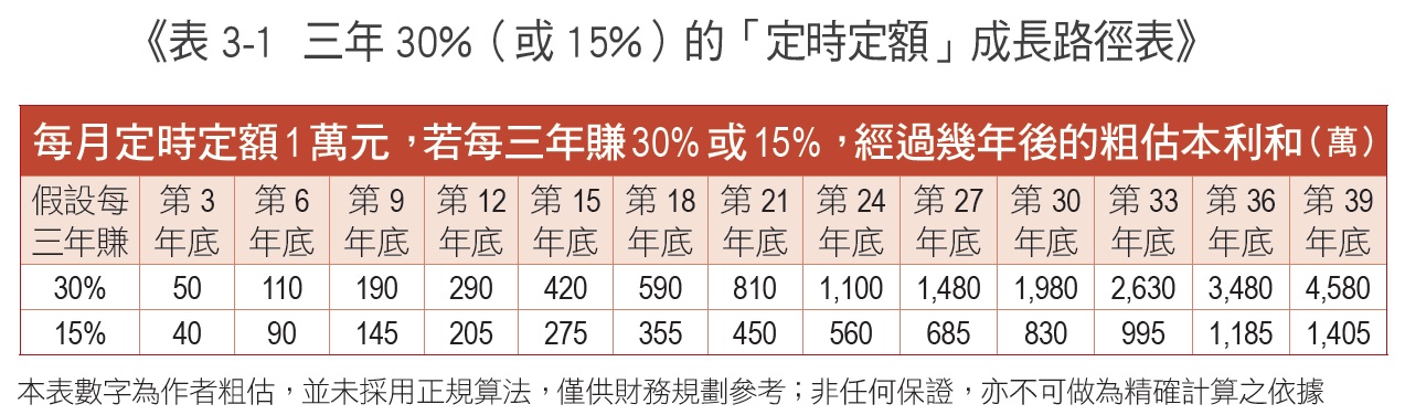 若做定時定額每月1 萬, 查《表3-1》39 年底時, 約1,405~4,580 萬。若每月只做3 千,按比例0.3(=3 千/1 萬)可得約421~1,374 萬。