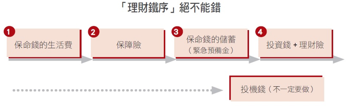 請記住,小錢可以借,緊急大錢只能靠保險!照這個理財鐵序,你的收入扣掉生活費之後,必須立刻把1 組保險買起來,然後方可進行2 筆投資,每筆每月至少3 千元。收入不夠的話,1 組保險仍不可少,而2 筆投資就等收入多些時再逐筆做。