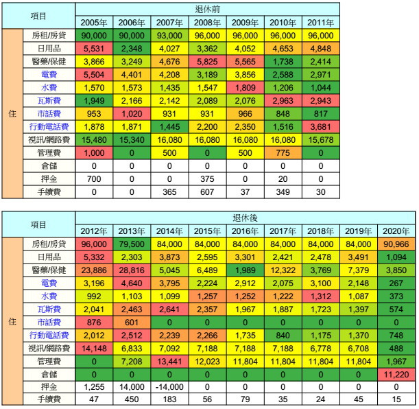2020年很多項目的色塊都變成綠的,因為我執行了「居無定所實驗計劃」,居住費用整個降低很多。