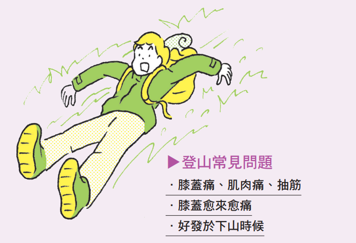 登山時,最常遇到的問題就是膝蓋痛、肌肉痛以及抽筋。膝蓋疼痛通常好發下山時,而且屬於緩慢性疼痛,想必不少人都有相同經驗,我也是其中之一。