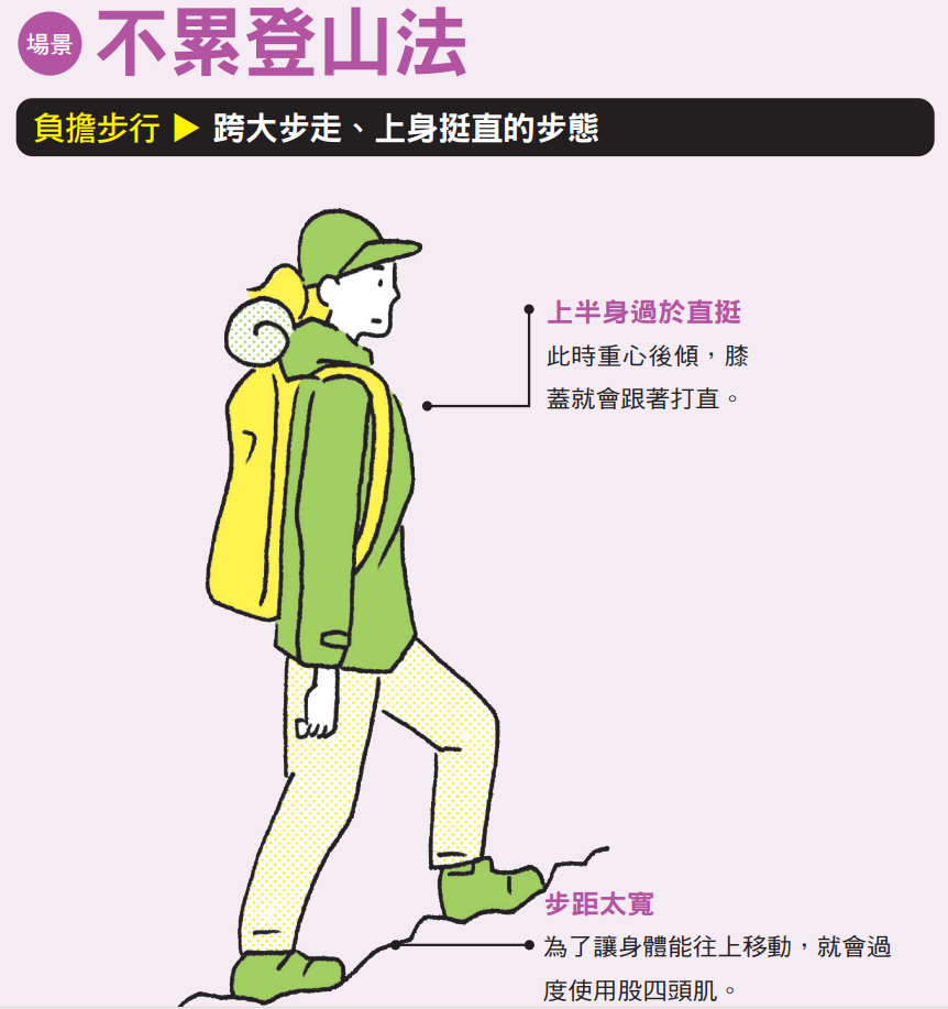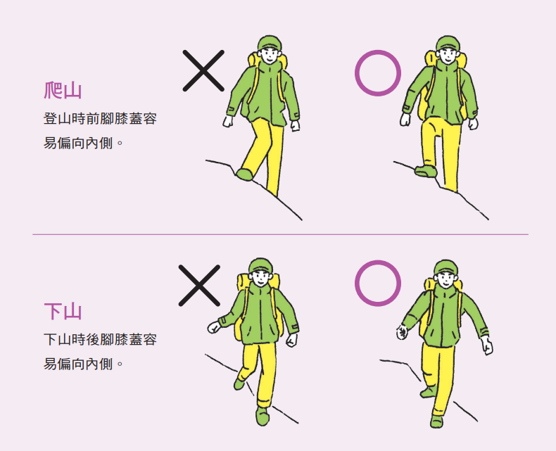 事實上爬山是項對身體負荷較大的運動,當爬得很累時,在平地走路的壞習慣就會表露無遺,所以膝蓋容易往內側偏的人,得從日常的步行方式著手改善。