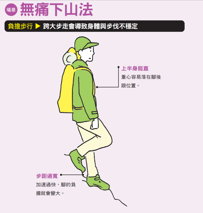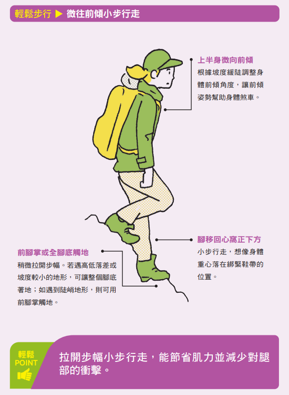 而下山時若速度太慢,就必須使用更多能量煞車,也會對身體造成額 外負擔,所以下山時的步伐最好維持固定節奏。