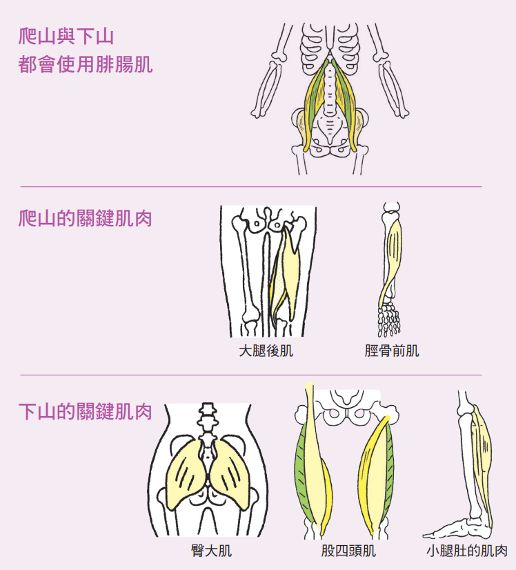 如下圖所示,爬山與下山使用的關鍵肌肉不同,了解相關肌肉將有助 於爬山前的訓練。