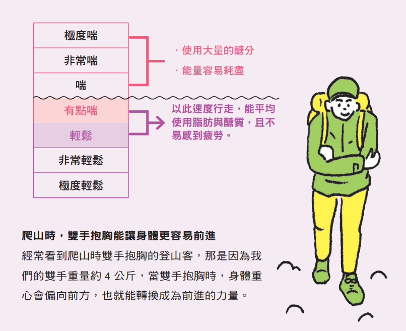 爬山比下山耗費更多能量,也因此多數人僅擔心熱量不足問題。事實 上運動的強度才是重點。爬山要以覺得「有點喘」的步速前進,才能優 先使用體內所儲存的脂肪(參考下圖)。