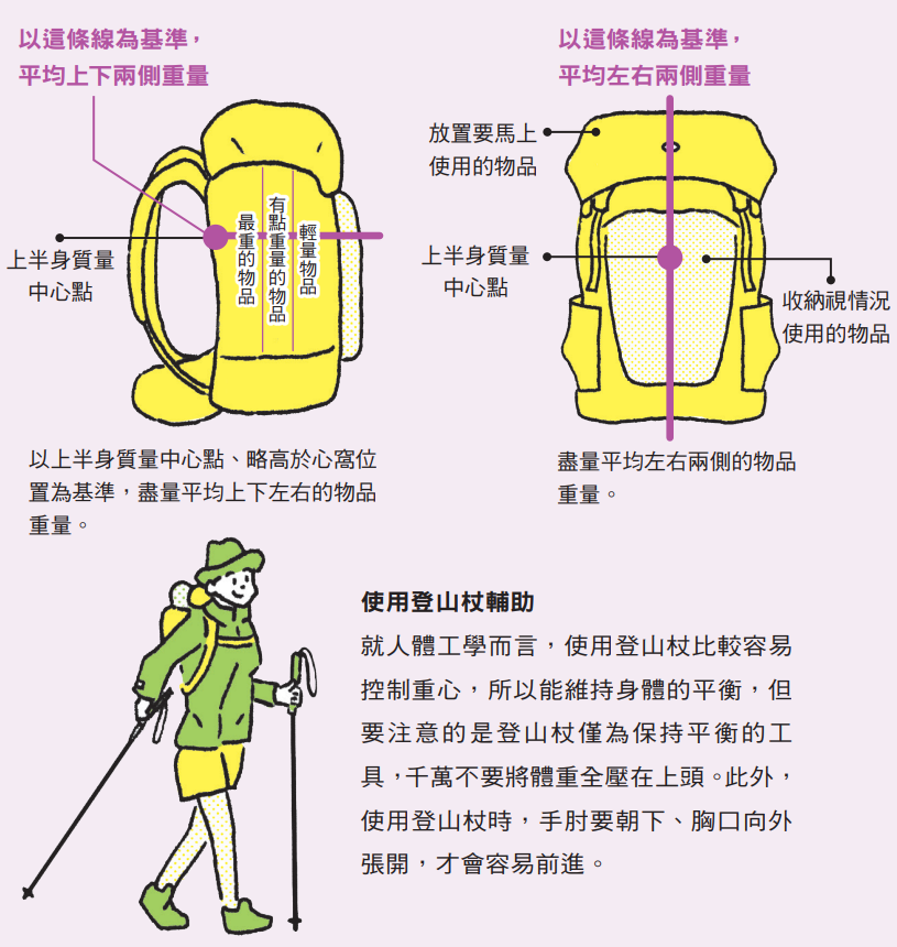 爬山時這些繩帶也可能鬆掉或是位移,所以必須不斷調整,亦建議大家根據自己的體型選擇適當的背包款式。此外,正確的打包方式,還可讓腰部與肩膀同時負重並減少身體疲勞。