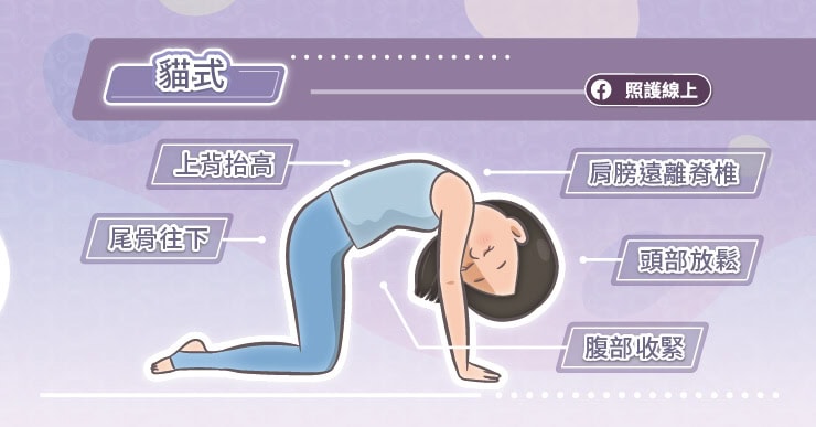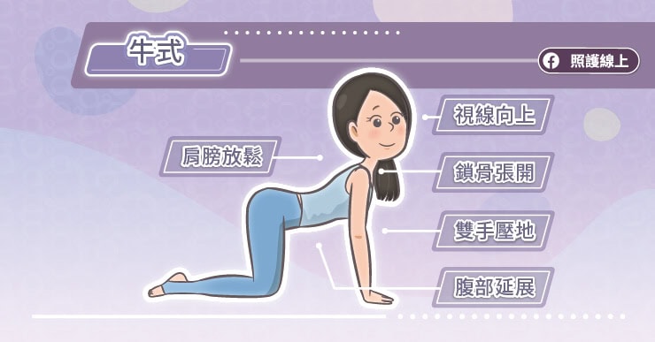 小提醒:通常很少單獨做貓式或牛式,而是會與貓式交替練習變成「貓牛式」,吸氣牛式,吐氣貓式,讓脊椎輪流落下與拱起,效果最好,記得配合呼吸慢慢練習。