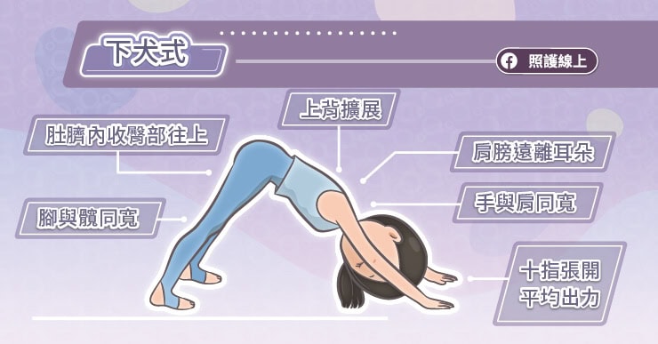 小提醒:剛開始練習下犬式時,不要講求一步到位。剛開始腳跟碰不到地沒關係,可以膝蓋微彎、腳跟離地,重點是感覺到脊椎延展。或者雙腳可以練習輪流踩地,一次先伸直一隻腳。若是手腕敏感者,可以墊毛毯或調整手的位置。記得十隻手指頭是分開的,兩隻食指的方向約往著正前方。