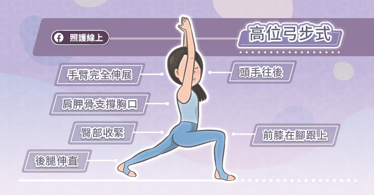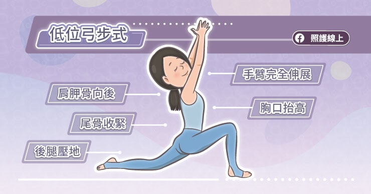 小提醒:初學者可先練低位弓步式,逐漸過渡到高位弓步。如果無法維持平衡,先讓雙手撐地,再過度到雙手放前方大腿或雙手合十放胸前,讓上身維持平衡後再舉起雙手過肩。