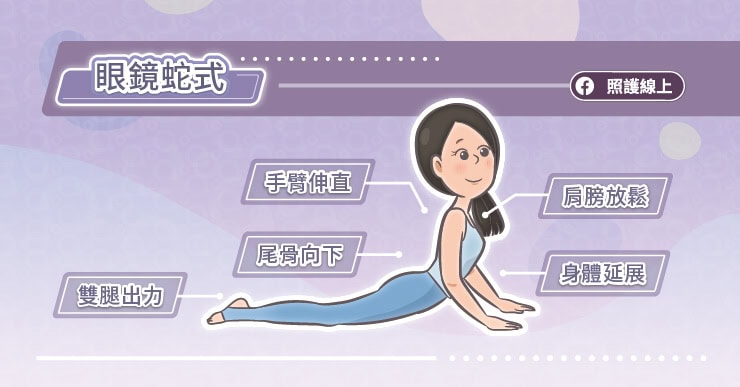 小提醒:從彎曲手肘到撐直手臂的過程中,手臂都要繼續貼著肋緣,手肘不向外,力量從背部與核心啟動,不要只靠手臂硬撐。萬一動作之間覺得下背很緊繃,要彎曲手肘,下降身體高度,做「寶寶眼鏡蛇baby cobra」就好。