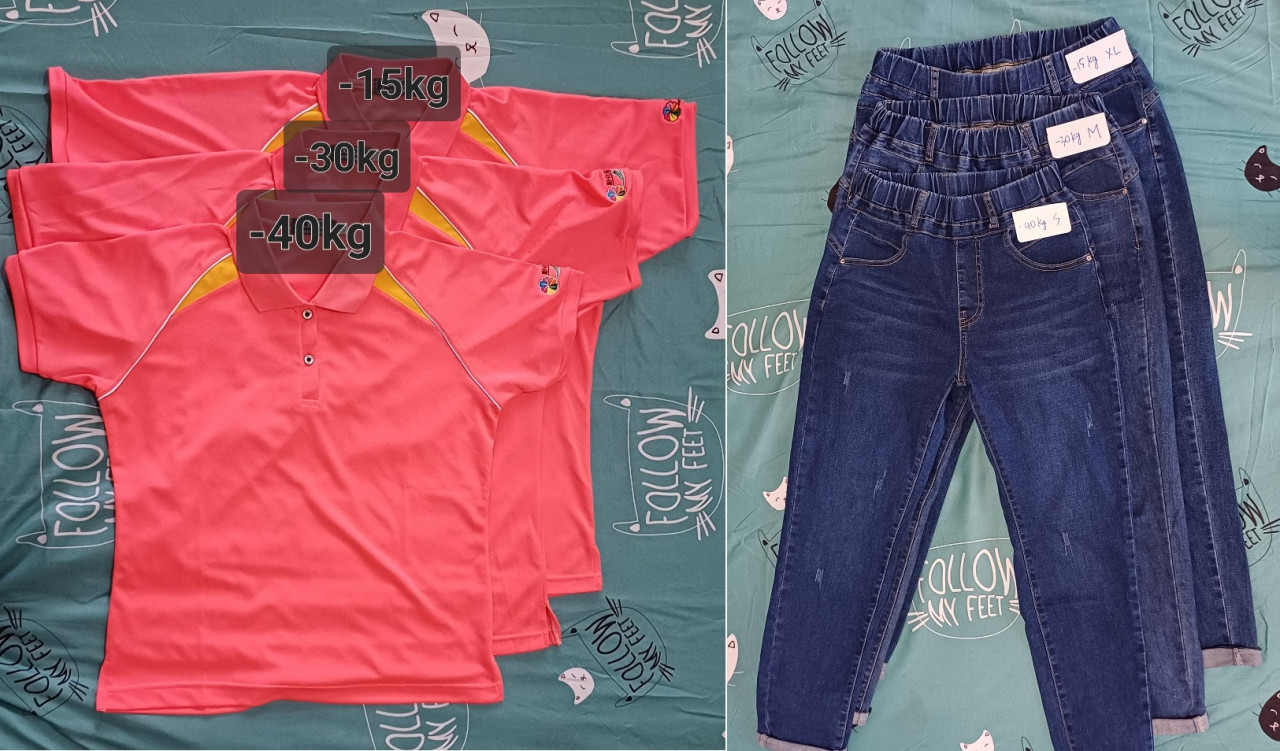 吳雅婷去年6月踏上減重旅程後,衣服尺寸越穿越小,BMI從38.3變19.5,體脂率從42.7變15.3,腰圍從95公分減到62公分,褲子也從5XL的褲子一路縮到S,「能穿進Uniqlo的S碼褲子,連自己都超感動!我以前根本不逛Uniqlo的,因為根本穿不進去,想買也沒辦法,只能路過。」