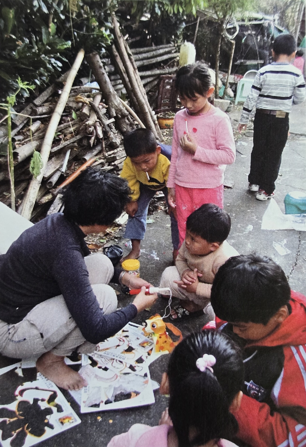 ▲最早期新住民課輔班,學童在地上作畫。