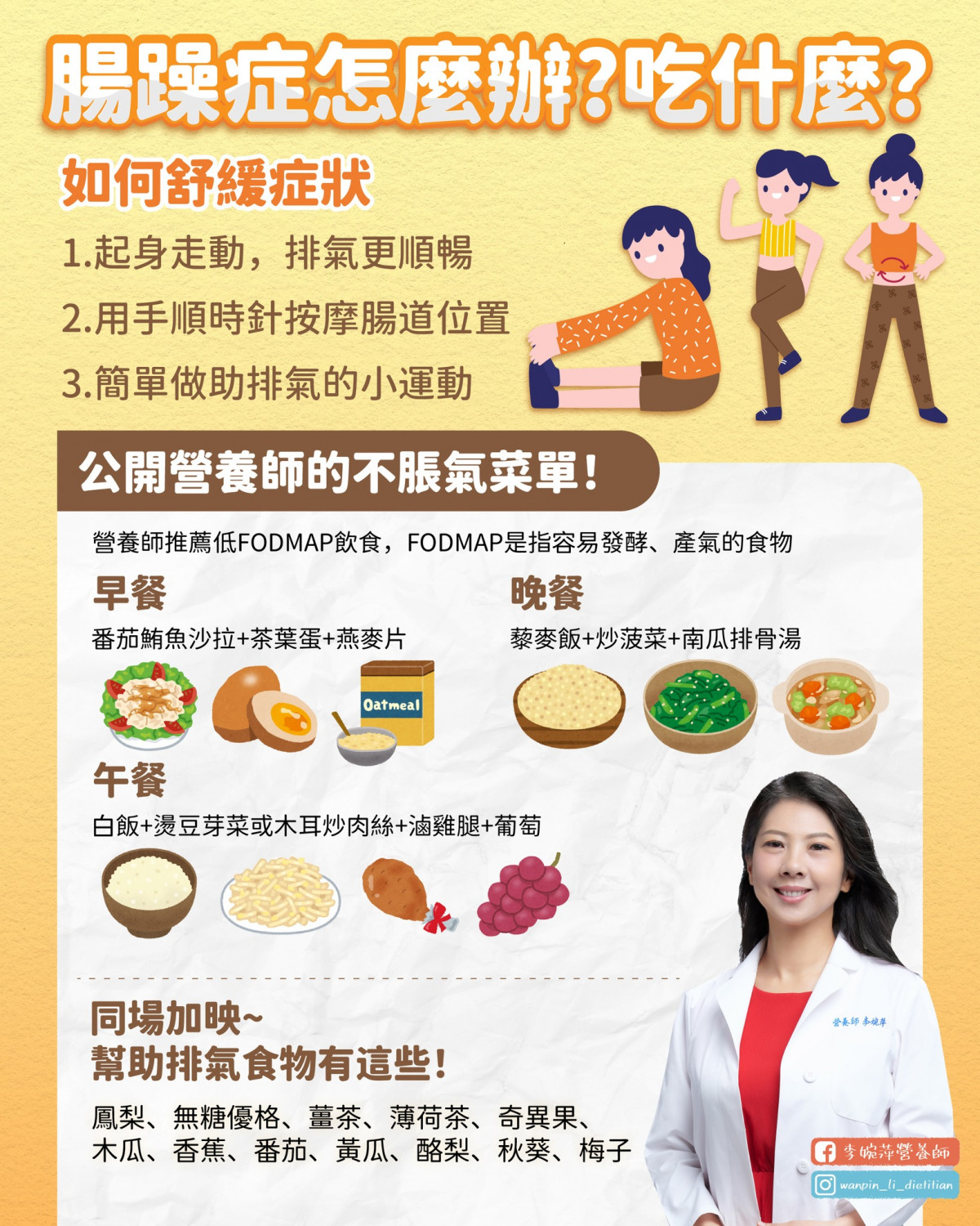 營養師推薦低FODMAP飲食,FODMAP是指容易發酵、產氣的食物,低FODMAP(低腹敏)飲食食材有像雞蛋、肉類、藜麥、燕麥、番茄、葡萄、草莓、菠菜、豆芽等。