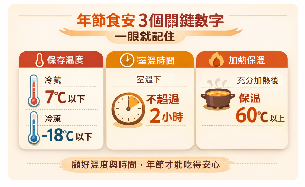 在料理與保存過程中,確實洗手、生熟食分開處理、食物充分加熱,都是降低病原菌污染的基本原則。熟食若放置於室溫,時間不宜超過2小時,保存時應低於7℃冷藏或維持60℃以上保溫,特別是肉類與海鮮,更需確保完全加熱後再食用。