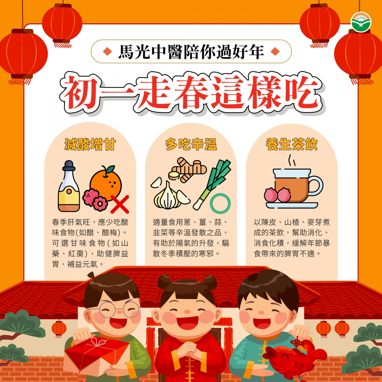 走春雖重於行,但飲食調攝亦不能忽視。春節期間大魚大肉,容易造成「食積」和「脾胃負擔」。