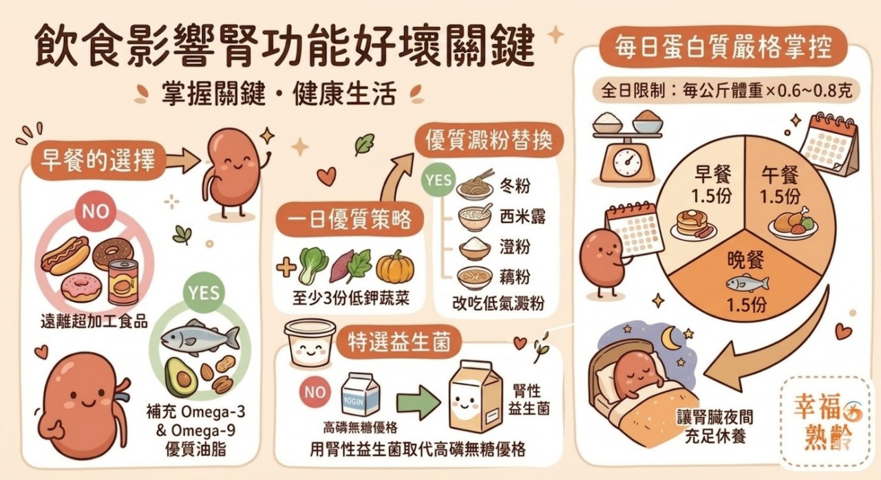 洪永祥建議對方,早餐應遠離超加工食品、補充 Omega-3與Omega-9優質油脂、至少攝取3份低鉀蔬菜,並用腎性益生菌取代高磷無糖優格,改吃低氮澱粉如冬粉、西米露、澄粉、藕粉等,也要嚴格掌控全日蛋白質攝取量,限制在每公斤體重乘以0.6至0.8克,早餐、午餐各攝取2份、晚餐減至1份,讓腎臟在夜間獲得充足的休養空間。