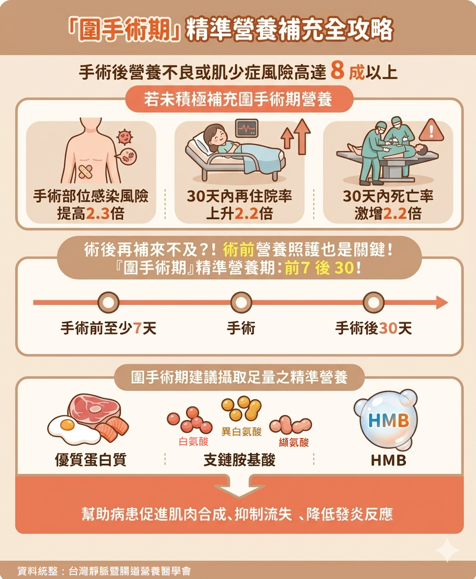 「圍手術期營養照護,顧名思義就是透過完善的營養照護來『包圍手術』,建議在術前至少7天開始,延續到術後30天積極準備。」